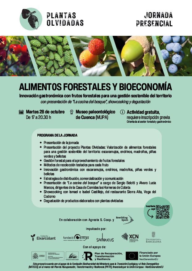 En esta jornada se revisarán las oportunidades del aprovechamiento de frutos forestales en la península, los métodos de recolección, distribución y comercialización, así como la innovación gastronómica desarrollada en el proyecto, que gira en torno a productos como la piña verde de Pinus sylvestris y Pinus nigra, la bellota de encina (Quercus ilex), las endrinas (Prunus spinosa), los escaramujos (Rosa sp.) y las cerezas de madroño (Arbutus unedo).